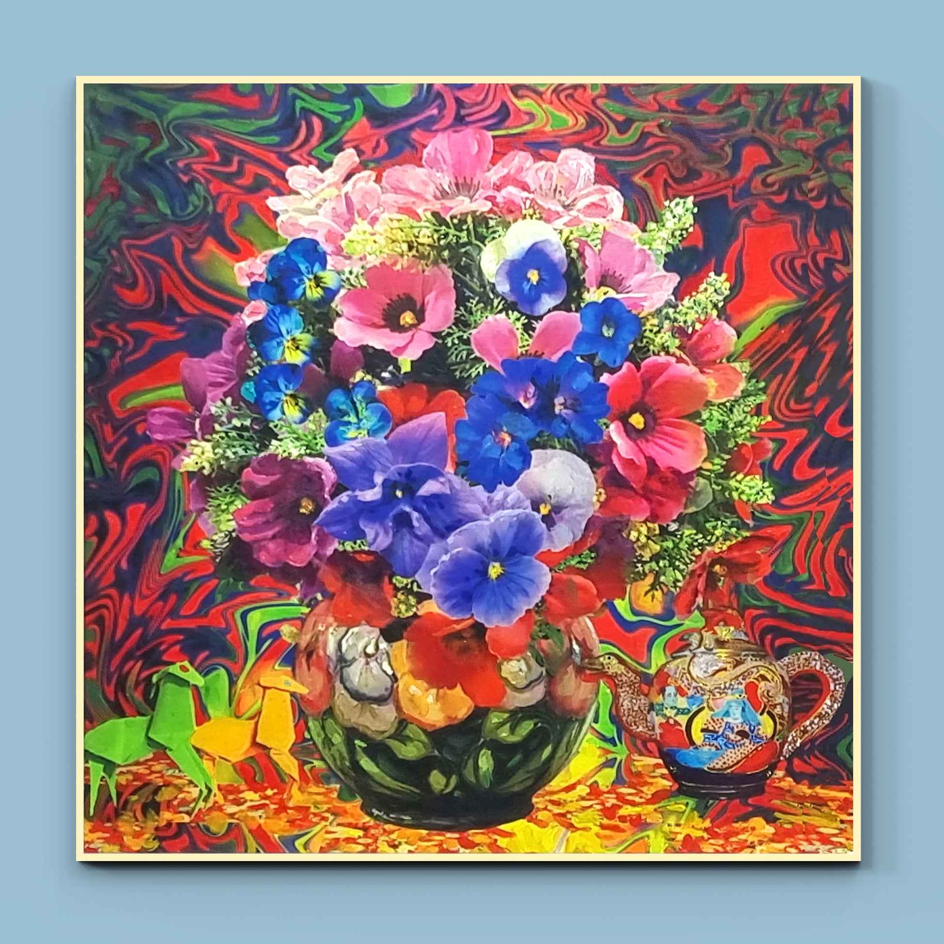 גודל היצירה 78 על 78 על 2.5 ס"מ; לא ממוסגר מתוח על מסגרת עץ.