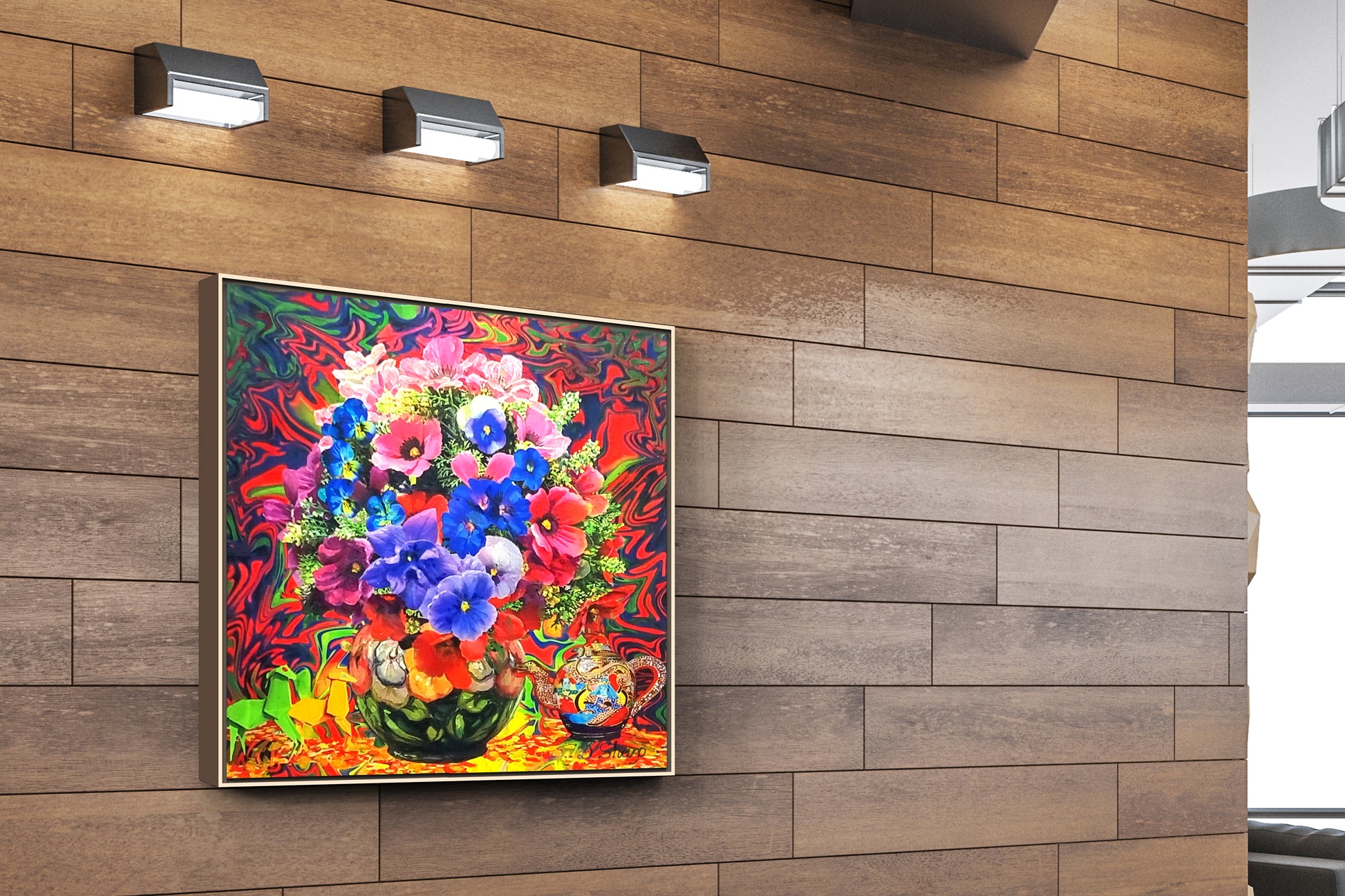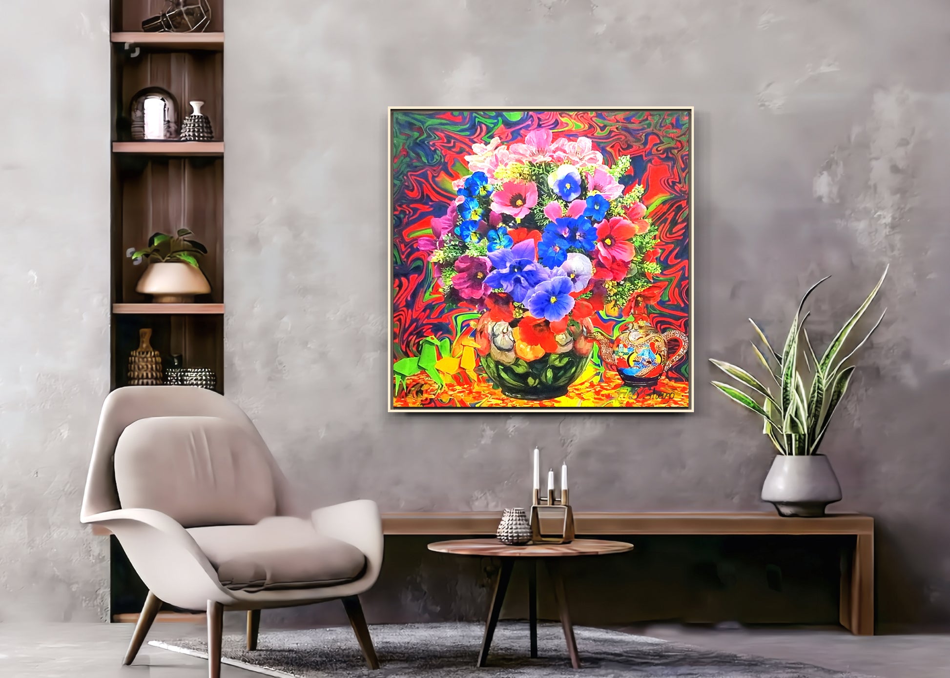 יצירת אומנות מתוחה וממוסגרת במסגרת עץ צפה. גודל יצירה עם מסגרת 82 על 82 על 4.3 ס"מ.
