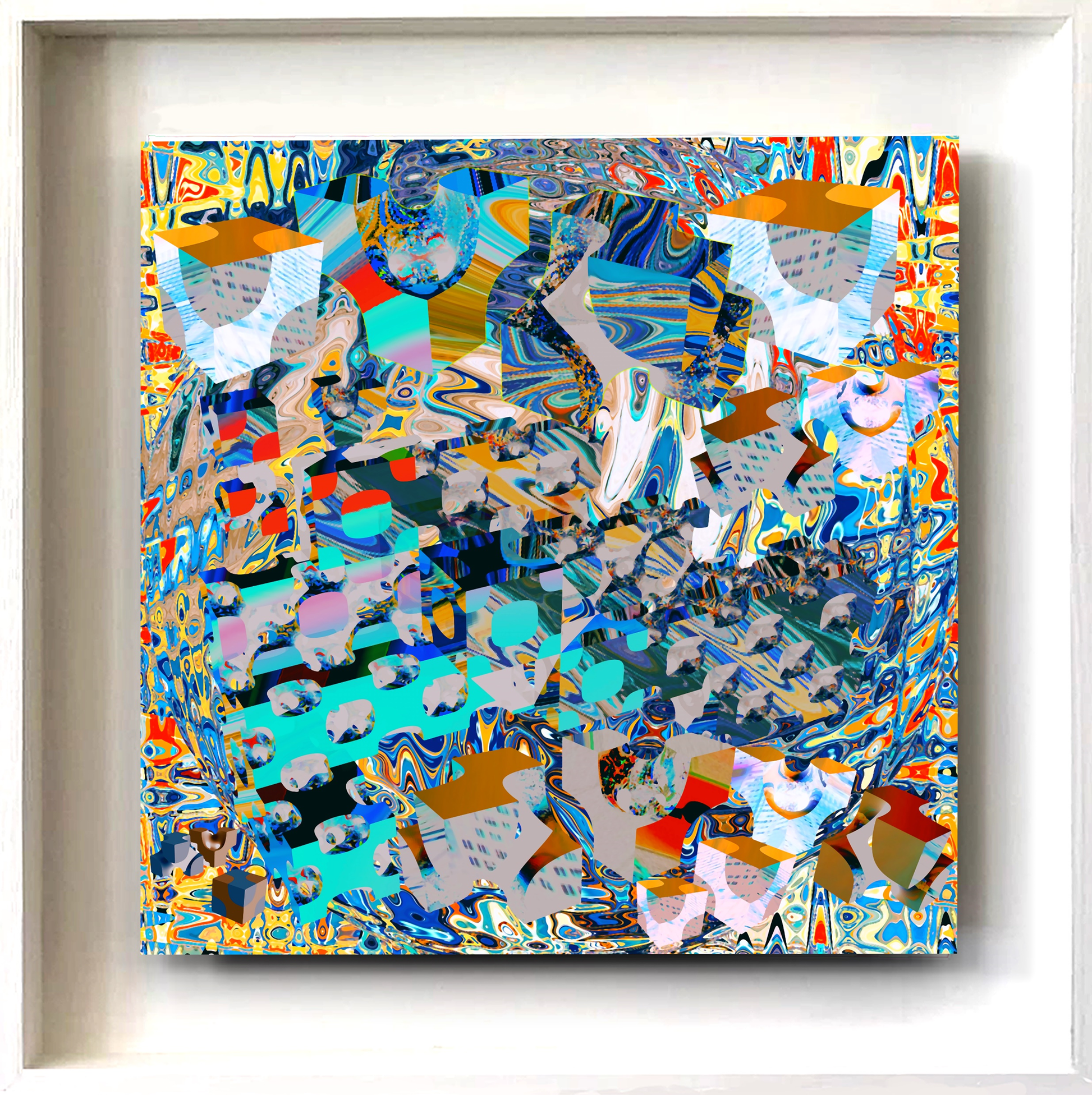 יצירת אומנות מתוחה וממוסגרת במסגרת עץ צפה. גודל יצירה עם מסגרת 82 על 82 על 4.3 ס"מ.