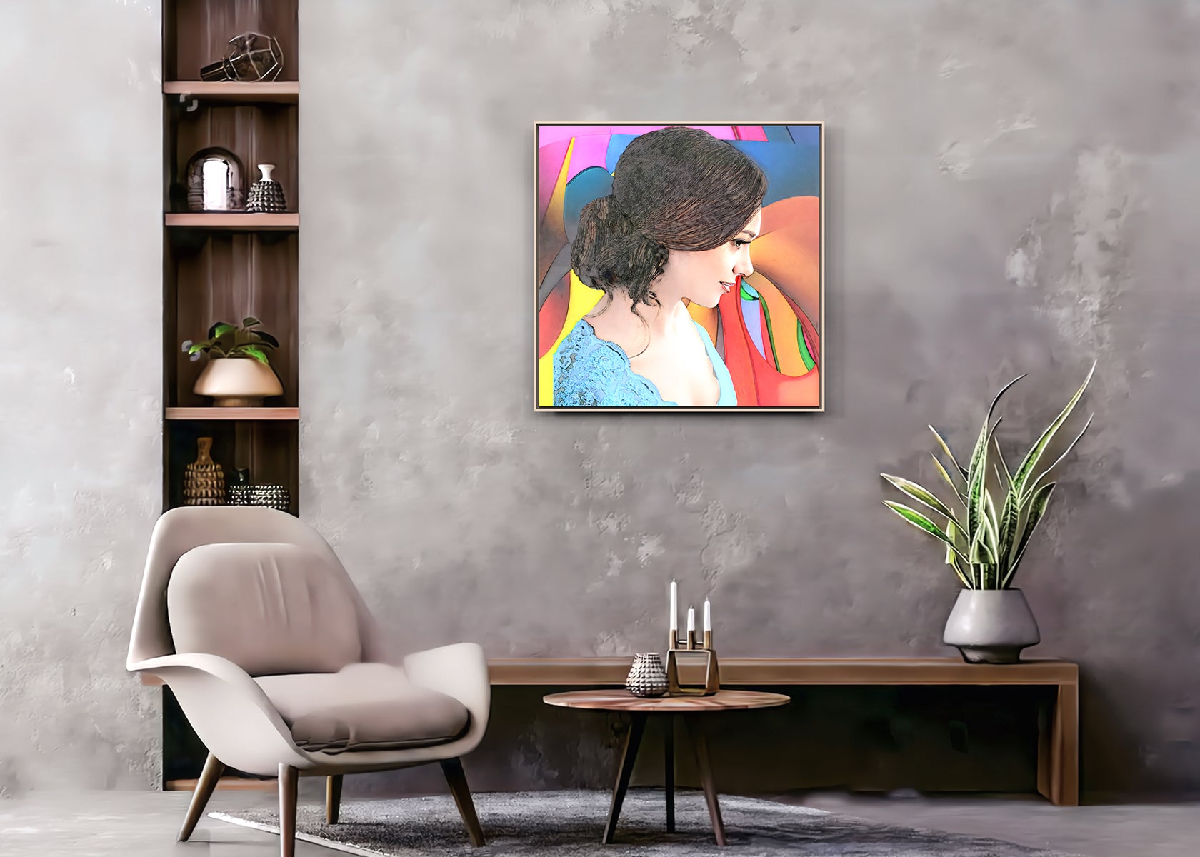 יצירת אומנות מתוחה וממוסגרת במסגרת עץ צפה. גודל יצירה עם מסגרת 82 על 82 על 4.3 ס"מ.