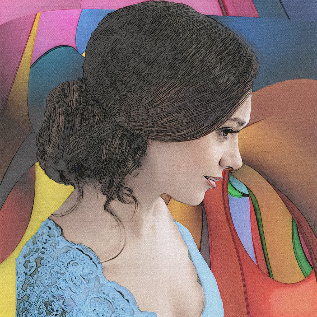 יצירת אומנות מתוחה על מסגרת מעץ. לא ממוסגרת, גודל יצירה 78 על 78 על 2.5 ס"מ.