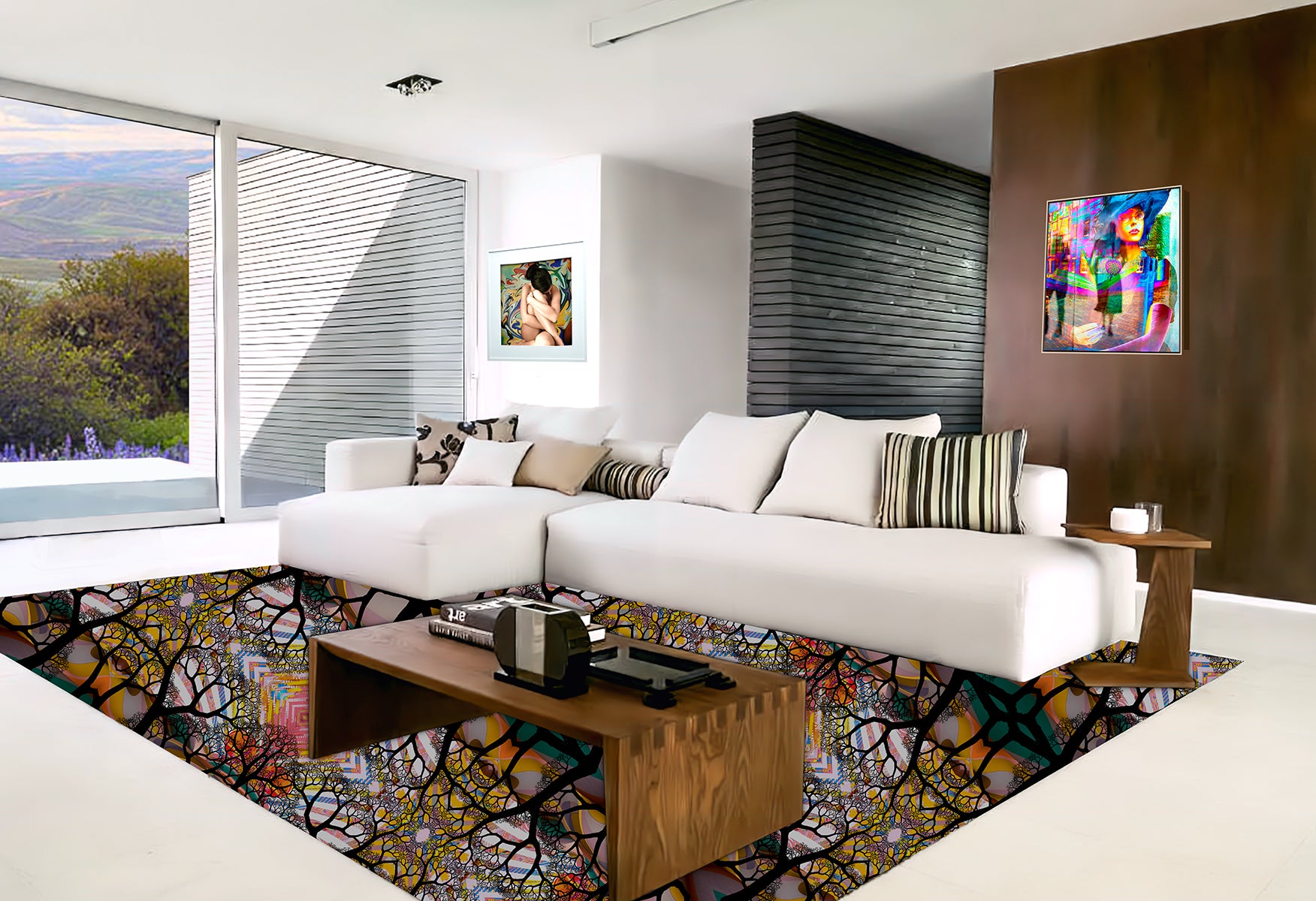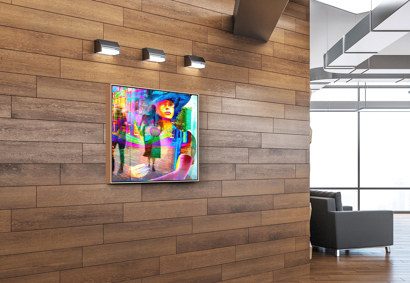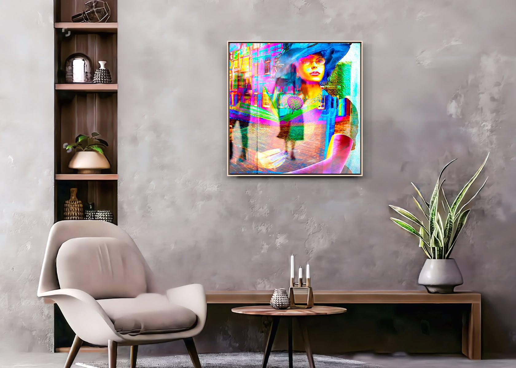 יצירת אומנות מתוחה וממוסגרת במסגרת עץ צפה. גודל יצירה עם מסגרת 82 על 82 על 4.3 ס"מ.
