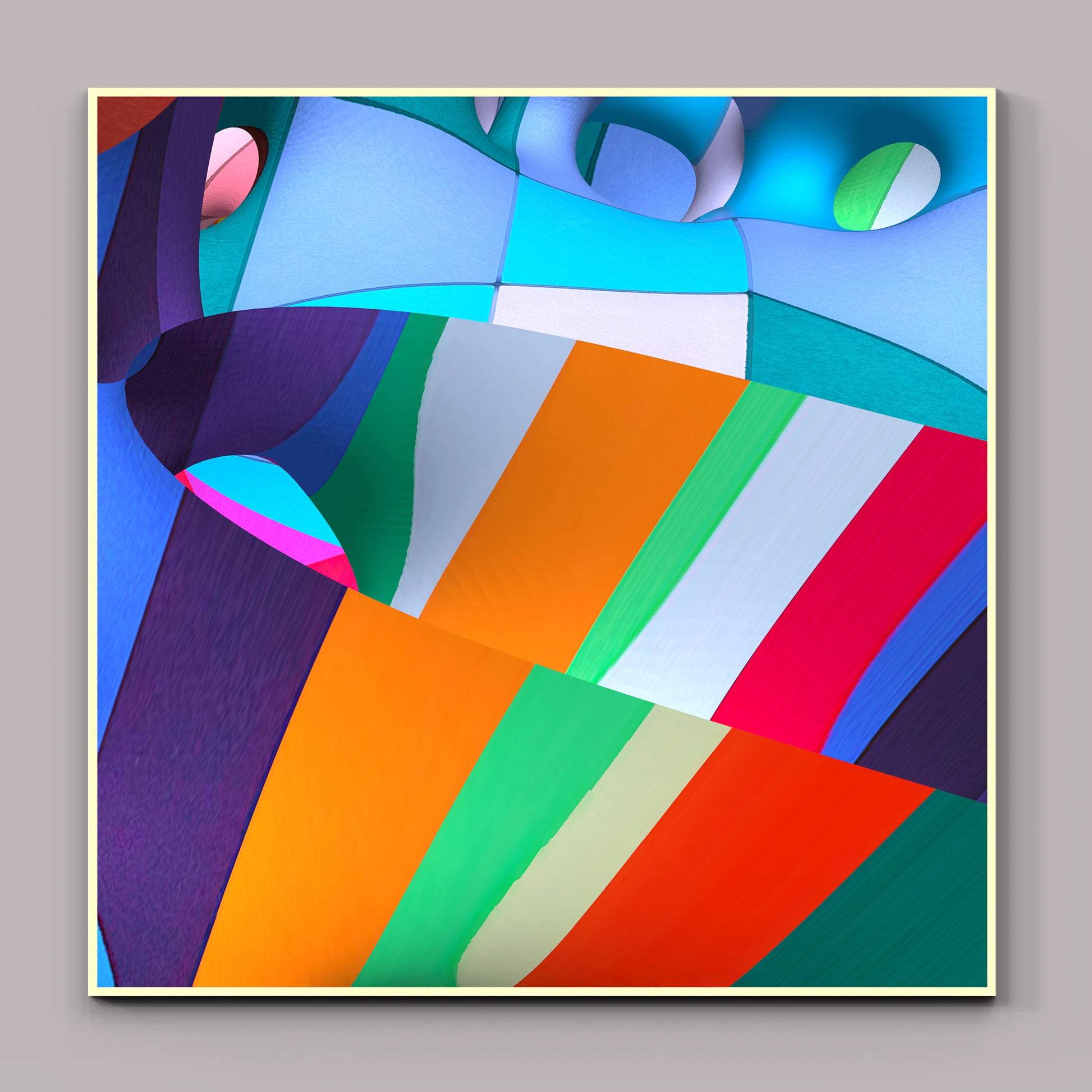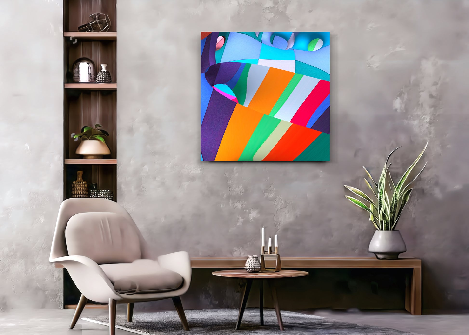 יצירת אומנות מתוחה על מסגרת מעץ. לא ממוסגרת, גודל יצירה 78 על 78 על 2.5 ס"מ.