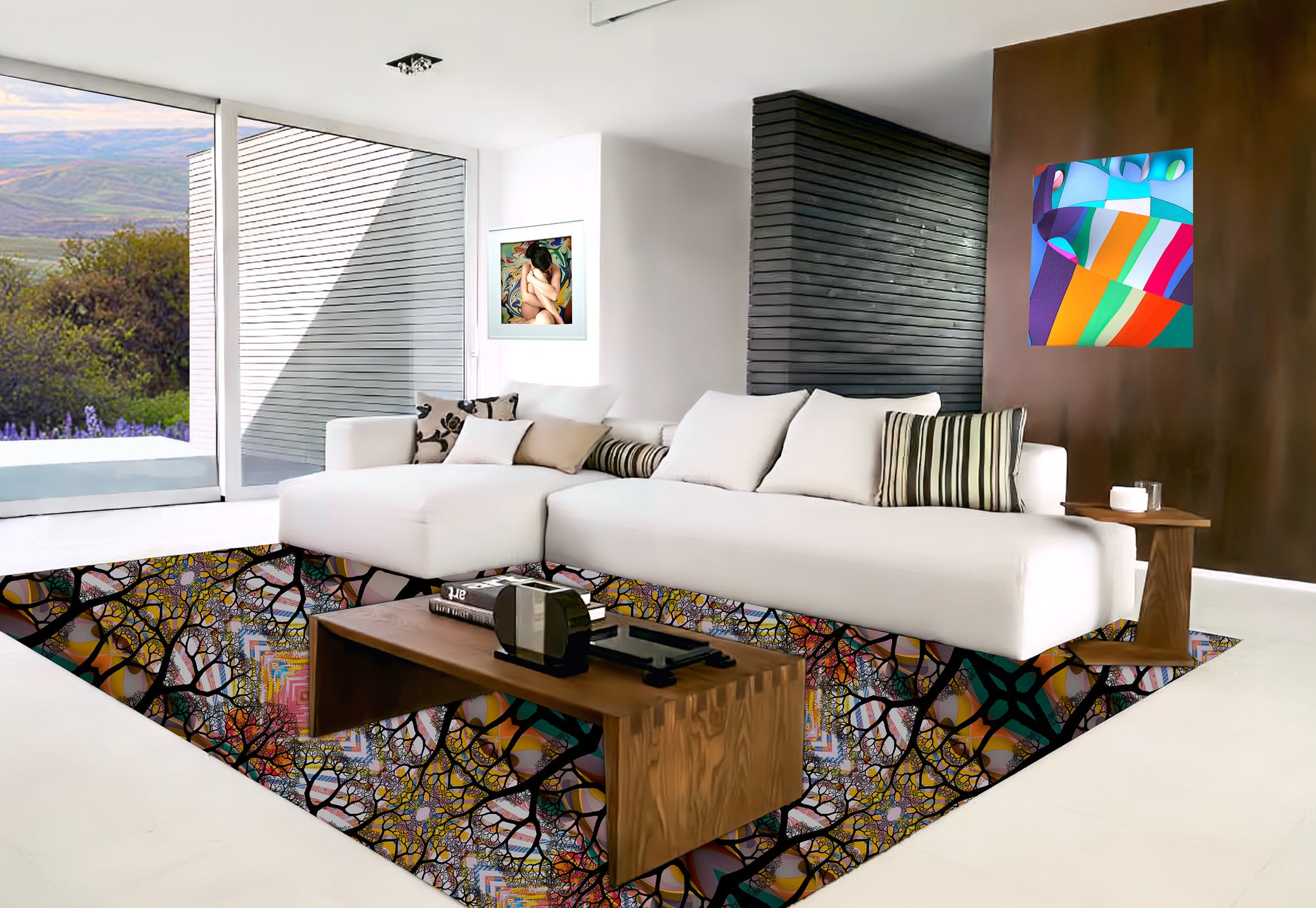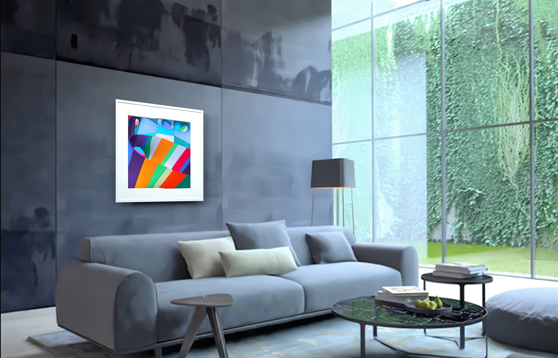 יצירת אומנות מתוחה וממוסגרת במסגרת עץ צפה. גודל יצירה עם מסגרת 82 על 82 על 4.3 ס"מ.